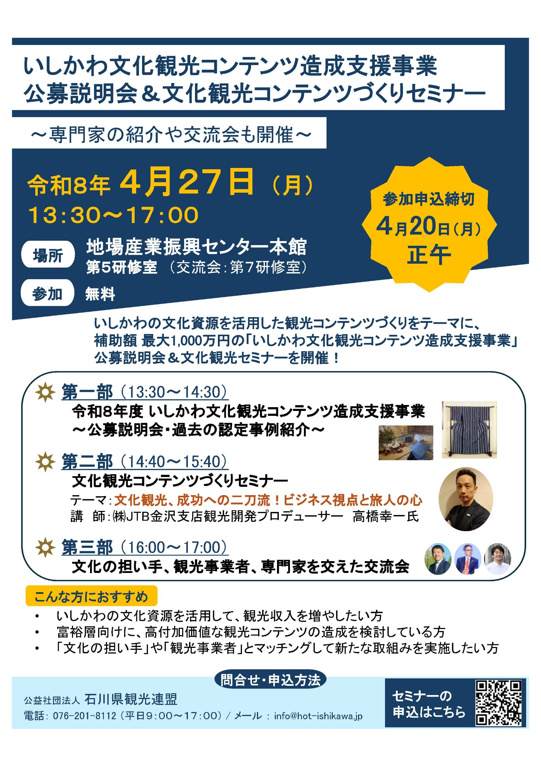 【公益社団法人石川県観光連盟】令和8年度いしかわ文化観光コンテンツ造成支援事業、公募説明会・文化観光コンテンツづくりセミナーのご案内